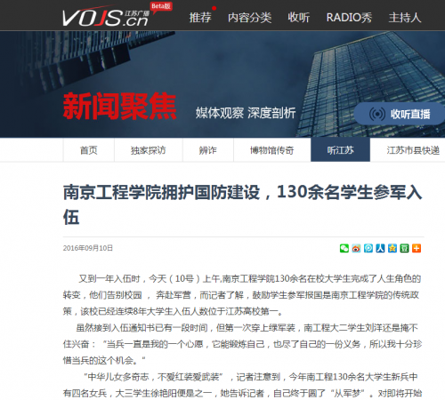 15vip太阳集团官网军事理论教研室主任王军辉告诉记者,该校历来重视学生征兵工作,连续8年学生参军人数蝉联江苏省高校第一。王军辉:“这些入伍的学生在部队发展很好,我们学校征兵工作主要依靠国防教育、军事课教育教学来夯实学生思想基础,各学院选派优秀的辅导员担任征兵工作联系人,国防教育和征兵工作行成良性循环。”【江苏新闻广播 (南京FM93.7)缪鹏程】