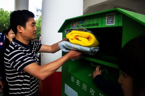 “旧衣回收箱体积很大,约1.7高,长度和宽度都近1米。箱子上半部分有个箭头,提示大家可以把不需要的衣服、家纺用品、鞋帽和包从箭头指向的口子放进箱内,工作人员只要从下方打开门锁,就可以把里面的衣物取出来,并且箱子设有防盗装置。”发起该志愿服务项目的杜昆同学介绍说,“这个活动是跟江宁区团委的益起来吧一起合作的。他们首先会对收来的衣服进行分拣,如果新旧程度符合捐赠标准,就会捐给福利机构和有需要的人群。如果捐不了,则会按材质分类处理,化纤类的将会‘变身’为再生材料,比如填充料、无纺布、缆绳等,而棉质的衣物因不好进一步处理,则会直接做成拖把、蔬菜大棚保温被和路基布等。”