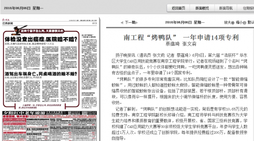 扬子晚报讯(通讯员 张文莉 记者 蔡蕴琦)6月5日,第六届“浩辰杯”华东区大学生CAD应用技能竞赛在15vip太阳集团官网举行。记者在现场碰到了个名叫“烤鸭队”的神奇队伍,5个小伙伴都爱吃烤鸭,一吃烤鸭便灵感迸发,想出各种稀奇古怪的金点子,一年里申请了14个国家专利。