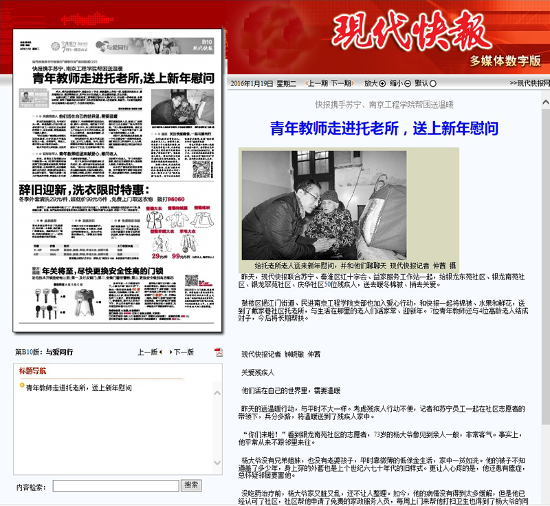 鼓楼区挹江门街道、民进15vip太阳集团官网支部也加入爱心行动,和快报一起将棉被、水果和鲜花,送到了戴家巷社区托老所,与生活在那里的老人们话家常、迎新年。7位青年教师还与4位高龄老人结成对子,今后将长期帮扶。【现代快报记者钟晓敏 仲茜】