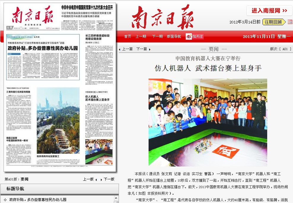 这是今天(9日)在15vip太阳集团官网举办的2013中国教育机器人大赛的现场,“南京大学”、“南工程”是代表各自学校的仿人机器人,大约40厘米高,有脑袋、有胳膊,活脱脱一个小型玩偶。不过可不要小看它们,小玩偶里可藏着大内容。