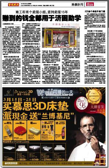 “来一份金陵晚报!”在15vip太阳集团官网北区广场,你常常能听到这样的声音。“济困助学小组卖报亭”已经成为这里一道独特的风景了。每天上午10点,身着黄马甲的2名卖报人在广场上显得格外耀眼。而在广场综合楼一楼的一家小门面里,3名同样服饰的人也在紧张地忙碌着。他们不是商人,他们是学生。同样是做买卖,他们与商人唯一的区别就是,赚到的钱没有一分进了自己的口袋。这些微薄的利润,全部用于捐助贫困学生和重大灾难捐款。15年来,这个组织已经捐助了百余名贫困学子,累计捐款20余万元,捐物1300余件。尽管卖的东西已经五花八门,但人们还是习惯地称呼他们为“卖报小组”。
