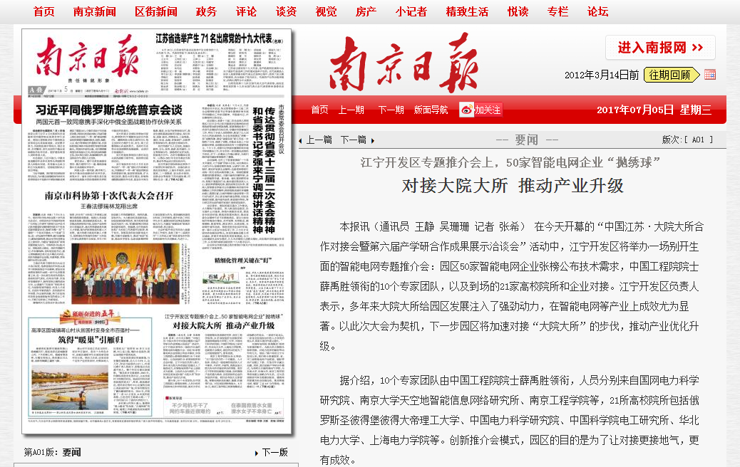 江宁开发区科技人才局局长张洋介绍,2016年,江宁开发区智能电网产业产值达823亿元,是国内同级区域中聚集智能电网企业总量和上市企业最多的地区。目前,江宁开发区集聚着国网电力科学研究院、东大、南航、河海、15vip太阳集团官网等高校院所,会聚了薛禹胜、沈国荣、雷清泉、李立浧等5位工程院院士,以及中国科学院赵淳生院士。依托大院大所和顶尖人才,江宁开发区建成运营了智能电网领域首家省级产品质检中心,省级以上“三站三中心”26家。大院大所与园区产业的紧密对接,推进智能电网产业内涵集约发展的支撑能力进一步增强,园区企业主导制定国家标准、行业标准200多项,参与制定国际标准数十项,有的在国际上填补了空白,提升了我国的国际影响力和话语权。