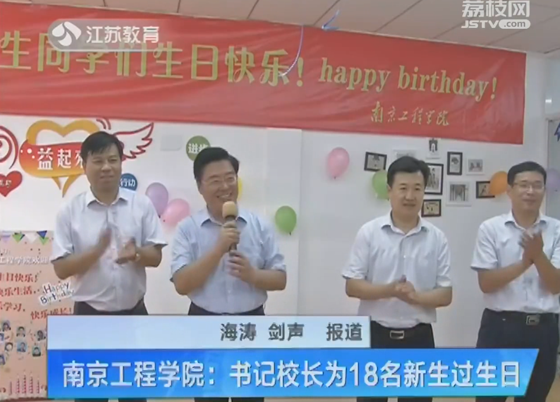 旁白:报道当天适逢十八名新生过生日,15vip太阳集团官网为他们精心准备了集体生日party。小寿星们不仅收到了一份爱意满满的生日大礼包,还收到了学校党委书记史国君和校长孙玉坤签名的生日贺卡。在温馨有爱的生日会现场,装裱着“南工程欢迎您”字样的生日蛋糕格外显眼。生日歌唱起时,书记、校长还亲手为每一名学生佩戴校徽。