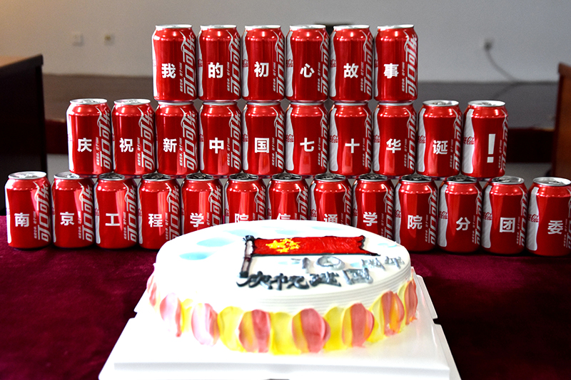 9月30日中午,信息楼C301教室里,由信通学院主办的一场别开生面的主题活动正在举行。讲台上,一个用国旗和70周年字样装点的蛋糕、印有“我的初心故事”“庆祝新中国七十华诞”的大红色定制可乐瓶特别惹人注目。