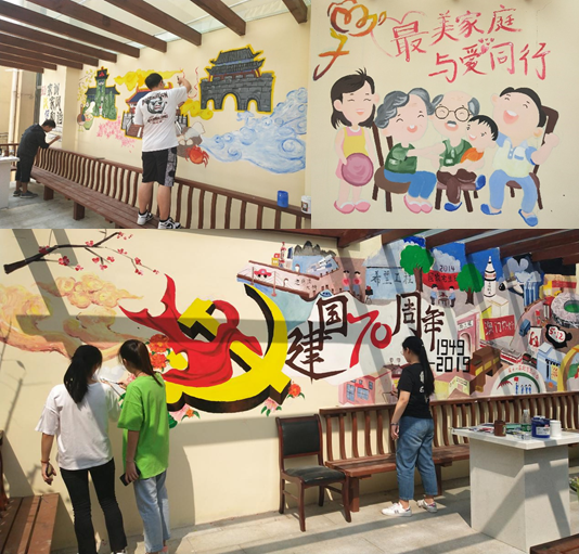 活动中,同学们根据墙体的形状布局与区域位置,设计出不同风格的绘画内容。在墙体绘制中,同学们以小组形式展开轮班绘制,以积极阳光的精神面貌认真地描画出每一个线条。通过3天的绘画,同学们在墙上画出了新中国成立70年来的辉煌历程与繁荣景象,画出了社区和睦融洽的友好氛围,获得了横岭社区负责人和老人们的一致好评。