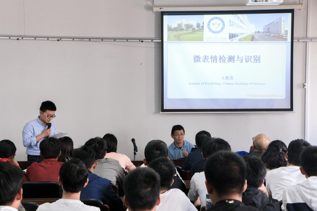 王甦菁, 中国科学院心理研究所副研究员,硕士生导师,主要研究方向为模式识别与机器学习,特别是微表情识别,被新华社称为“中国版霍金”。报告会上,王教授从自己如何走进“微表情”领域说起,逐渐深入,向老师和同学们介绍了微表情的应用方向、研究历程和微表情研究所涉及到的微表情数据库知识,阐述了他在微表情的检测与识别方面的研究成果以及LBP编码、深度学习和AU编码系统等理论知识。结合几段微表情的视频,加深师生们对“微表情”的理解与认识,王教授渊博的知识和幽默的风格深深吸引了在场每一位师生,现场掌声一度热烈不绝。