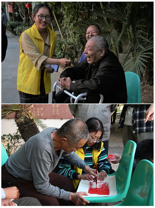 活动中,志愿者与敬老院老人一起以“我心中的祖国”为主题手绘环保袋。老人们兴致勃勃,沧桑的皱纹舒展成一张张笑脸,各组“忘年朋友”配合默契,利用颜料、画笔等工具发挥创意,在环保袋上画出自己心目中祖国的样子,使原来洁白的环保袋变得五彩斑斓。部分老人在自己的作品上写上“我爱祖国”、“爱我中华”等祝福,表达了自己的爱国情怀。同时,志愿者以新中国成立七十周年家乡变化及发展为主题,邀请老人进行视频采访。“国家这些年发生了很大变化,过去是吃上顿少下顿,现在想吃什么有什么,物质供应非常丰富。看见祖国强大了,人民日子越来越好了,精神生活越来越富足了,我们打心里高兴、自豪!”在采访中高磊老人如是说道。参与活动的宋毅文同学感慨道:“虽然没经历过老一辈贫苦艰巨的生活,但通过老一辈的描述及现在优越舒适生活环境的感受,我们深切体会到祖国迅猛的发展,通过这次活动,我们更透彻地理解了作为青年一代应该担负的使命和责任。”