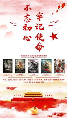 为扎实推进“不忘初心、牢记使命”主题教育,进一步增强党组织的凝聚力和战斗力,教育引导广大师生群众坚定理想信念、勇于担当作为,同时为了响应主题教育期间党员要积极参加志愿服务,为身边群众办好事的号召,艺术与设计学院学生第四党支部全体党员利用10月28日—11月1日晚间空余时间,安排值班,在至美苑•设计楼影视动漫厅为全校师生播放红色主题电影,举办“铭记历史,开创未来”主题电影教育周活动。