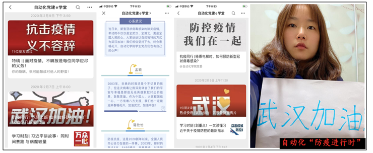 在自动化党委的号召下,学院全体学生党员开展抗击疫情服务工作,均承诺做到四个“坚决服从”、三个“带头表率”、两个“自觉自律”,在抗击疫情的战斗中发挥旗帜引领作用。在这场没有硝烟的战斗中,学生党员们主动担任班级疫情信息网格员,在网络平台发起学习号召,组建学习帮扶小组、共享读书学习笔记,掀起带头学习之风。他们还担任网络防疫知识、防疫信息收集员,精选各类信息在自动化学院在线党建e学堂推出“抗疫同行”专题栏目并发布防疫“微心得”,坚持以实际行动彰显决心、发挥作用、贡献力量,充分发挥党支部的战斗堡垒和党员的先锋模范作用。