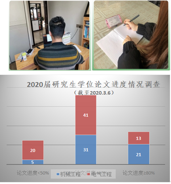 疫情发生以来,研究生导师们积极响应教育部和学校号召,认真进行在线指导,在学术研究和身心安抚等方面发挥第一责任人作用。有的通过微信建立组群,引导撰写工作文档、汇报工作进展;有的通过QQ群开语音或视频会,或单独微信私聊谈话指导;有的导师考虑到疫情对就业的影响,主动当起了学生的工作介绍人。对于不同年级的研究生,导师们结合年级学术需求开展针对性指导。面向一年级研究生,导师要求其学习相关知识;二年级研究生由于其分工不同,导师指导学生阅读文献,总结分析本领域前沿研究水平和发展现状,撰写文献综述、研究报告或学术论文,确定研究方向。针对已进入学位论文撰写阶段的研究生,导师指导其确定学位论文总体结构、创新性工作,对学位论文进行反复修改,确保学位论文质量。