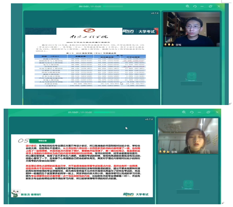3月24日,艺术与设计学院借助云教室平台对大一至大三的学生开展线上考研经验分享会。分享会主要帮助大一、大二学生规划考研之路,帮助大三学生了解考研学校、专业选择、初试备考、考研心态调整、考研院校调整等经验。分享会特邀新东方讲师李瑶以及该院考研高分学生工设161班王煜琳分享考研信息和经验。