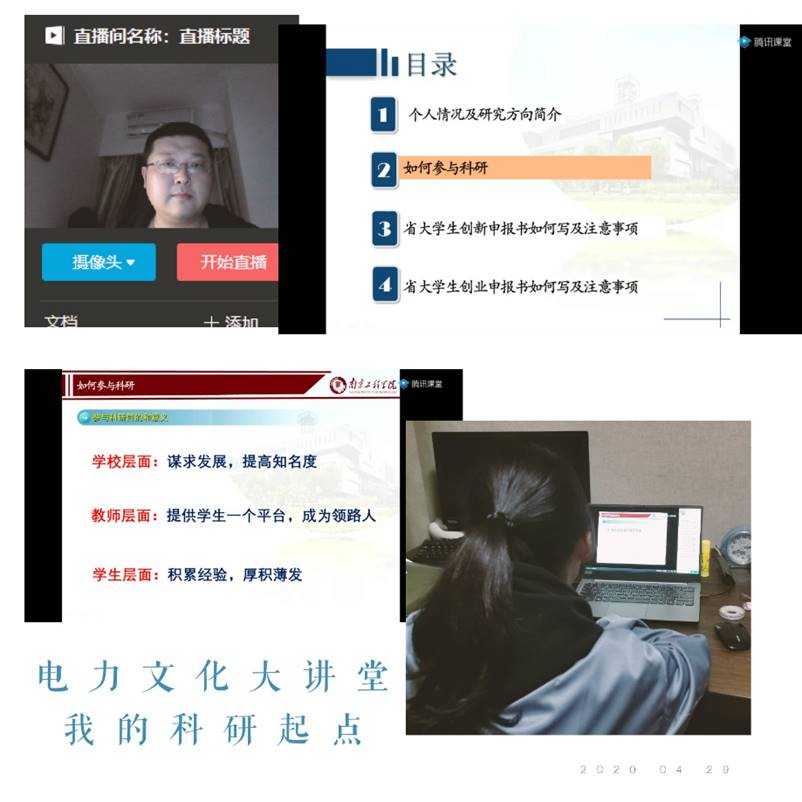 为增强电力青年的科研意识,提升他们的科研素养和水平,同时确保疫情期间学生全面发展不掉队,日前,电力学子盼望已久的科研类电力文化大讲堂在腾讯课堂顺利开讲,该院智能电网产业技术研究院院长助理陈光宇老师为983名同学作题为“我的科研起点”的讲座。