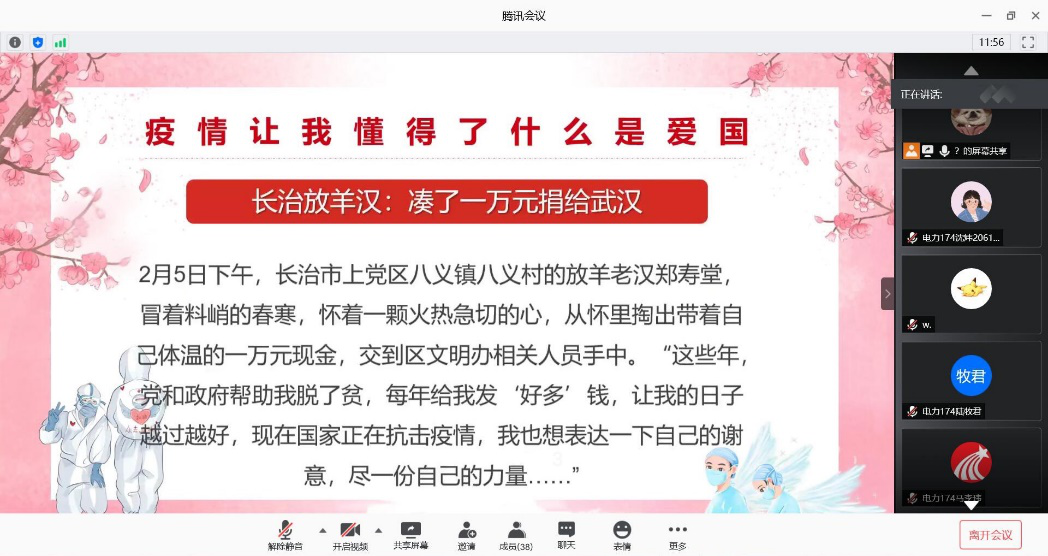 为提高学生心理调节能力,培养良好的心理品质,该院于活动期间组织各班举行了线上“现实不见,云上见”心理班会活动。班会紧紧围绕“你我携手,同心渡疫”这一主题,向同学们传递着同舟共济、顽强拼搏、共同抗疫、乐观向上的精神。电力193班以“热身游戏‘掌声响起来’”、“说说我的抗疫故事”、“我的宅家学习生活”、“悦纳自我快乐生活”四个模块展开班会。同学们踊跃参与,班长周潭同学生动描述自己的“宅家生活”,分享了增进疫情下亲子关系的三个方法:“多做事”、“多沟通”、“少争吵”。在“悦纳自我快乐生活”环节中,心理信息员周沁怡同学则向同学们科普了应对焦虑的三个方法:“运动发泄”、“合理睡眠”、“包容错误”,整个班会氛围融洽,同学们都表示受益良多。电力174班的心理班会,主要是向同学们介绍了关于新冠病毒的一些知识与防疫措施,科普简单的日常自我防护的小技巧,“面对疫情,我们要用科学的正确的态度积极面对它,戴好口罩,做好个人防护,不信谣不传谣”,心理信息员范宇杰同学如是说。