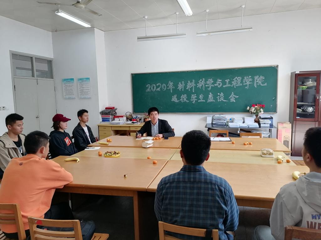 10月23日,材料科学与工程学院组织召开了2020年退伍复学学生座谈会。学院学生工作负责人、分管人武工作老师、往届退伍复学学生代表、2020年退伍复学学生参加了座谈会。