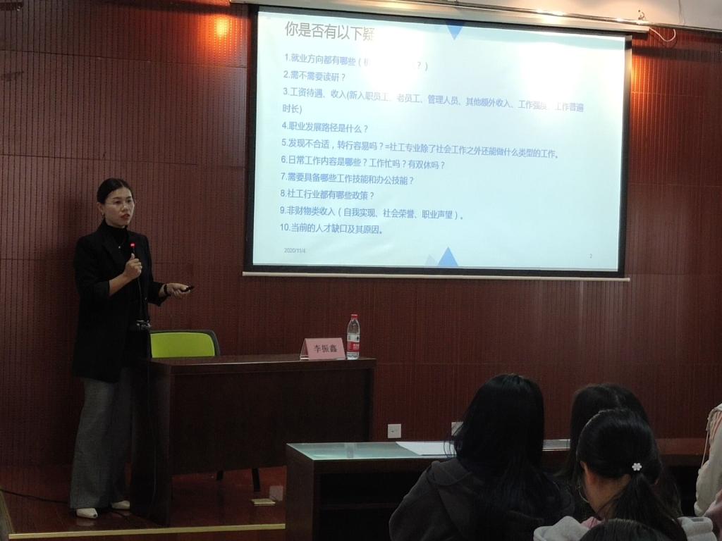 颁奖仪式结束之后,江苏省社会工作协会副秘书长李振鑫老师为同学们带来了一场题为“社会工作的职业前景与发展展望”的讲座。李老师从社工职业发展现状、需要面临的挑战、社工行业需要具备的能力以及对未来社会工作职业发展的展望四个方面展开讲座。“李老师的讲座贴近专业,贴近实际,让我们更加了解专业现状、面临的挑战以及未来发展前景,”听完讲座,同学们暗下决心:“自己一定坚持学社会工作,坚持做社会工作,相信社工的这条路被我们越走越宽、越走越远。”