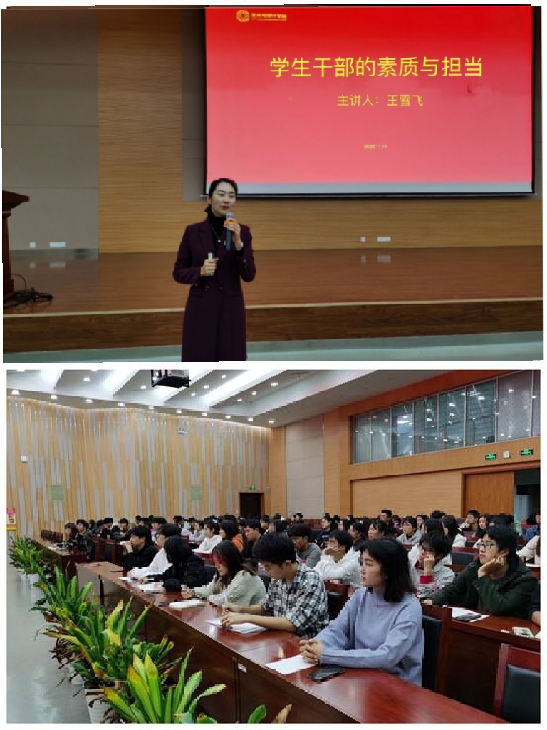 讲座伊始,王老师以“为什么要当学生干部,怎样做好一名学生干部?”引出话题。她指出,学生干部工作虽辛苦,但对自身能力的提升却是潜移默化的,作为学生干部,要清楚的认知自己的定位,学生、服务者、楷模、桥梁四者缺一不可,要严于律己,以身作则,在学生中发挥榜样作用,加强班级内部凝固团结,将榜样的力量深化影响到每一位同学。讲座期间,王老师和学生干部进行互动交流,产品设计201班长周星兆同学表示:“作为一名新生班委,希望自己能抓住机会,努力提升自我,把自己打造成一名合格的学生干部。”王老师对同学们能有积极向阳的心态表示肯定,她表示,“成功的意义在于超越自己”,希望艺术与设计学院的学生干部能够强化服务思想,树立榜样表率,提升综合素养。
