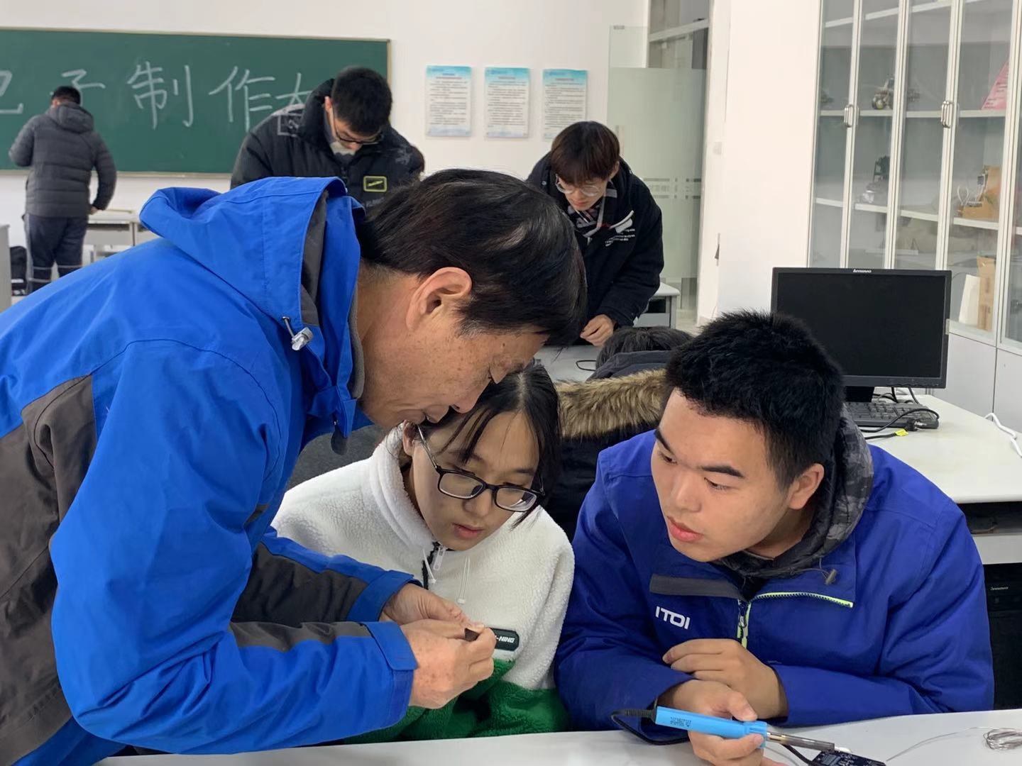 12月16日下午,自动化学院在工程实践中心4-206创新实验室举办电子制作大赛决赛,从第一轮笔试中脱颖而出的20支队伍,在这里进行电子焊接实物操作能力的PK。学院特邀拥有丰富电子焊接经验的关工委黄坚老师做评委。