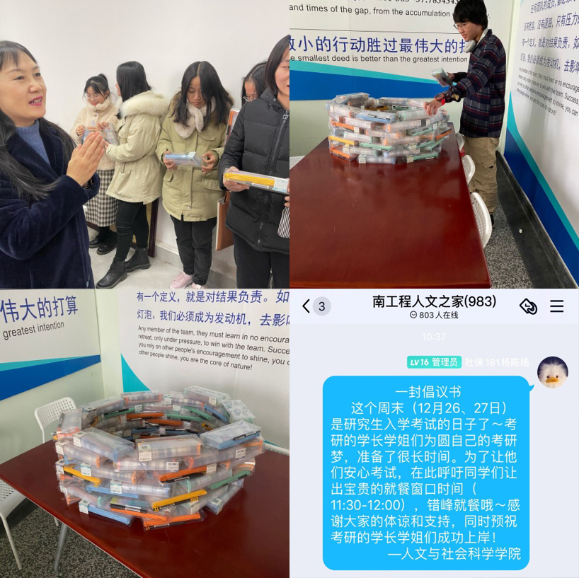 除了承载着老师祝福的“福袋”,学弟学妹们也行动起来,用一封倡议书为考研的学姐学长们送去温暖,“考研期间,呼吁同学们让出宝贵的就餐窗口时间,错峰就餐。同时预祝考研的学长学姐们取得好成绩!”人文院学生自发的倡议书“刷屏”了学生的班级群、社交群和朋友圈,温暖了考研学子的心。“虽然自己的考点不在学校,但看到学弟学妹的这份心意还是很感动。”赵子璇同学代表考研学子感谢学弟学妹们的理解与支持。