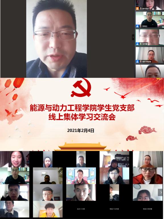 为深入学习贯彻习近平新时代中国特色社会主义思想、党的十九届五中全会精神,教育广大党员增强“四个意识”、坚定“四个自信”、做到“两个维护”,近日,能源与动力工程学院学生党支部组织开展了线上集体学习交流会,该院党委书记张祚键、党委副书记陈培杰、各学生党支部书记以及全体学生党员和部分入党积极分子代表参加了本次会议。