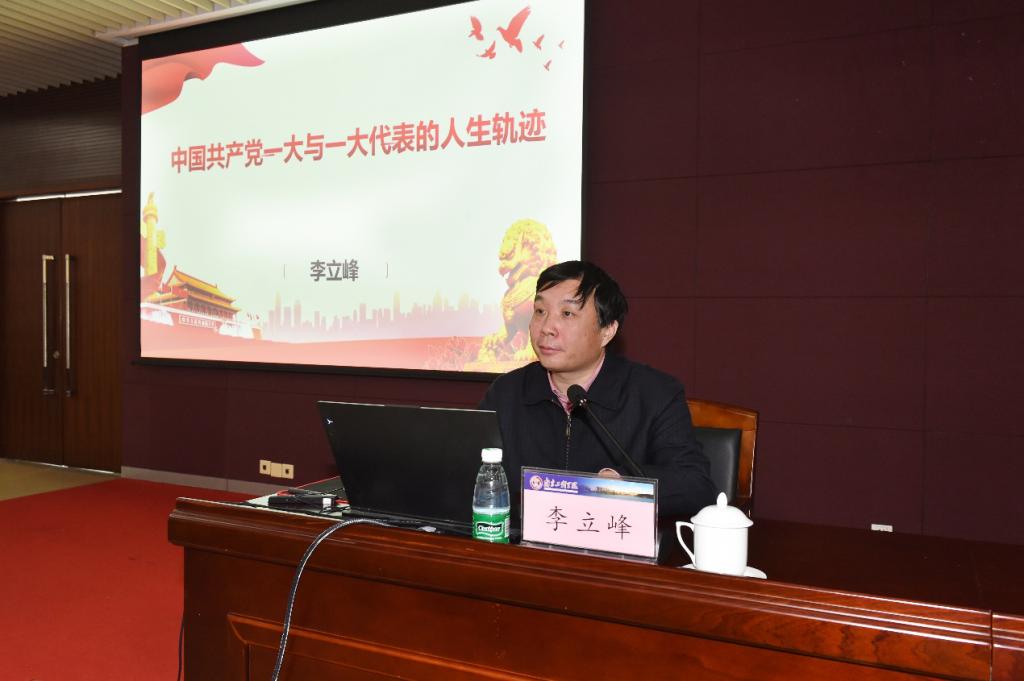 大会特邀中共江苏省委党校李立峰教授做专题报告。李立峰教授围绕“中国共产党一大与一大代表的人生轨迹”这一主题,从中国共产党的成立、中共一大的召开以及参加一大代表们的特征分析等几个方面,以鲜活详实的历史事件,带领大家共同回顾了中国共产党一大召开的重要意义和一大代表们不同的人生轨迹,引导广大师生做到学史明理、学史增信、学史崇德、学史力行,以昂扬姿态奋力开启全面建设社会主义现代化国家新征程,以优异成绩迎接建党一百周年。