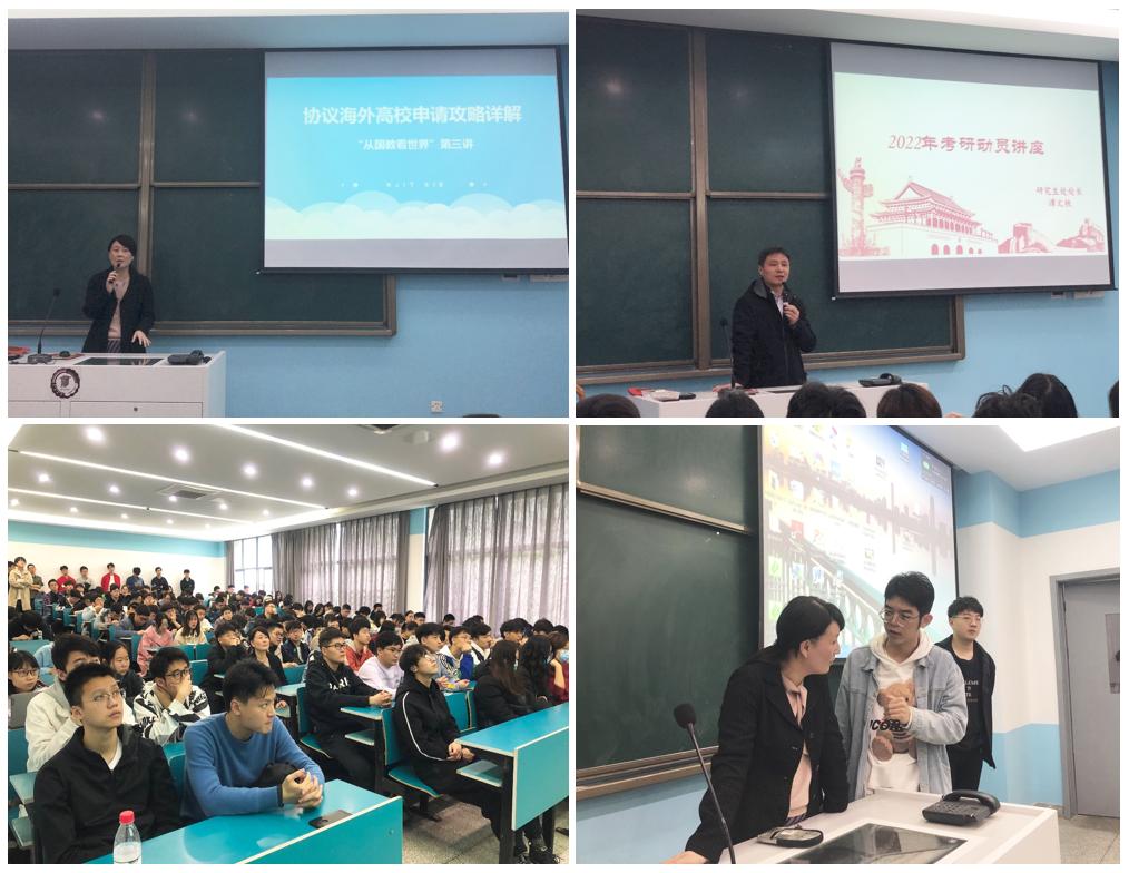 为推进学生就业工作,保障升学质量,4月12日,国际教育学院邀请软工(中外)192班第二班主任、研究生处处长谭文轶主讲,助力学生谋篇布局占先机,执笔画圆升学梦。该院执行院长蒋静主持讲座并就海外升学的形势与政策进行解读,2018级和2019级全体学生到场聆听。