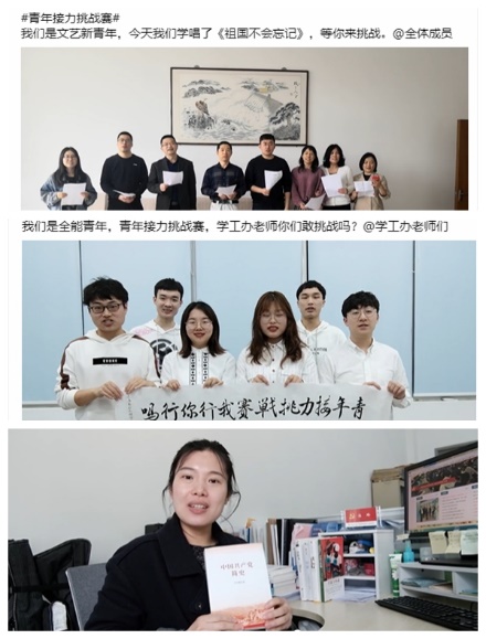 接力挑战赛从4月开始,学院收到众多创意满满、五花八门的短视频,如“学习青年”“科研青年”“自律青年”“环保青年”“养身青年”“‘光盘’青年”等。五四青年节来临之际,青年大学生们用多元的方式展现自我,诠释着新青年的责任与担当,他们还邀请第二班主任、专业教师、学工办老师一起加入到接力挑战的行列中。
