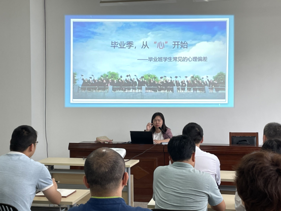 为更好地迎接2021年毕业季,学院特邀大学生心理健康教育指导中心的李宁老师为毕业班班主任开展“毕业生,从‘心’开始”主题讲座,学工办老师和全体毕业班班主任到场聆听。李宁老师以真实案例为切入点,从心理健康的标准、毕业生常见心理异常现象、心理危机干预与应对等方面进行讲解,并为在场的老师们提供了有效开展心理健康教育工作的办法。老师们也就工作中遇到的学生心理相关问题进行咨询,李宁老师一一进行解答,共同讨论如何将理论知识与解决实际问题相结合。