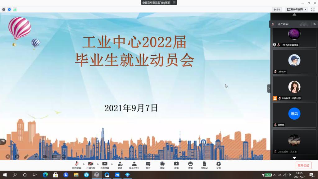 为推进毕业生就业工作,9月7日下午,工业中心召开2022届毕业生线上就业动员大会,中心党总支副书记王雪飞、辅导员以及全体毕业生参加了线上大会。