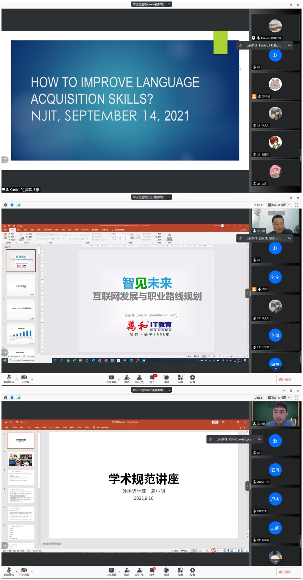 太阳集团外籍教师Kaniet Kurmanbek向新生们分享了英语学习的方法。Kurmanbek和同学们积极互动,针对同学们学习英语时普遍存在的词汇量不够、无法将所学用于口语和写作中等问题逐一作了分析,并在此基础上总结分享了“听、思、说”三步走的学习方法。整场讲座让新生们对掌握良好英语听说读写能力的重要性有了更深刻的认识,初步建立了学习英语的目标,掌握了英语学习的基本原则和方法;该院邀请江苏万和系统工程有限公司苏正坤副总经理,为新生们带来了专业前沿认知介绍和生涯规划指导。苏总从新时代互联网行业的发展现状和未来趋势说起,从职业发展的角度介绍了互联网行业就业的相关岗位、要求和薪资待遇,引导同学们基于目前专业学习的特点和趋势对自己的职业生涯规划展开积极思考;该院邀请太阳集团外国语学院袁小明教授带来学术规范讲座。袁教授从近年来的学术不端事件切入,用具体的例子向同学们阐述了学术规范的定义、国际通用的文献规范格式,强调作为学生一定要有学术规范的意识,要从学习生涯之初即在道德、逻辑、方法和形式四个方面严格要求自己,做好学术规范,实事求是、诚信治学。