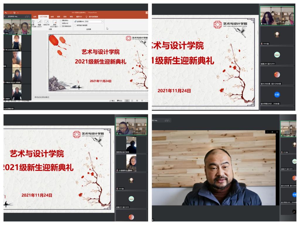 11月24日下午,艺术与设计学院在线举行2021级新生迎新典礼,学院党总支书记屈春芳、院长郑静、各系部主任、综合办主任、学工办主任、辅导员、2021级全体学生参加了典礼。典礼由学院党总支副书记胡晓清主持。