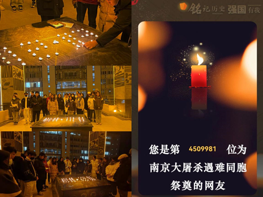 上午十点,学院组织全体同学线上参加“铭记历史,强国有我”国家公祭日“网上答题烛光祭”,用青春之火点亮信仰之光。当晚,学院组织学生在学海苑前广场开展线下祭忆活动,同学们用蜡烛摆成“12.13”字样,点点烛光在风中摇曳,同学们庄严伫立,秉烛默哀,并自发地走到烛光周围,共祭英烈,用自己的方式寄托一份哀思。“历史不会忘记,我们也不会忘记!作为新时代青年,我们会铭记苦难历史,汲取前行力量,愿战争之火长弭,愿和平之花长开。”