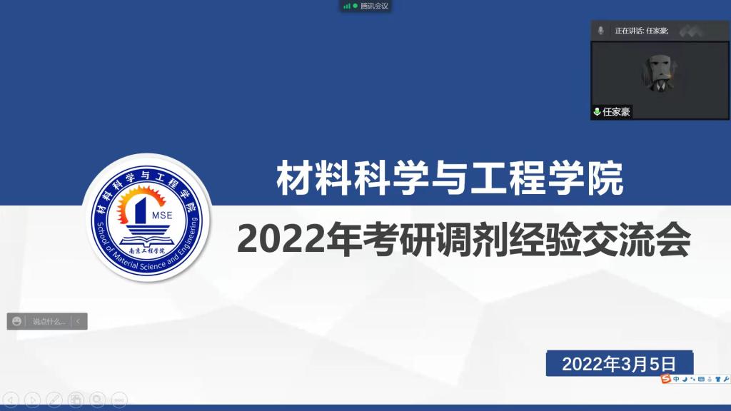 3月5日下午,材料科学与工程学院通过腾讯会议的形式召开考研经验交流会。会议邀请往届优秀毕业生黄月、余飞海、张楠、任家豪作为主讲。