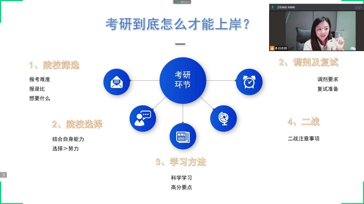 讲座伊始,刘老师从“考研到底怎么才能上岸”这一问题入手,从院校筛选、院校选择、学习方法、二战攻略、调剂和复试等方面进行讲解,让同学们对于考研各个环节有更清楚的认知,同时针对大三学生解答了关于考研备考的困惑以及为大四学生提供准备复试的经验。“刘老师的讲解干货满满,为我们考研的同学们指明了学习方向,明确了考研目标,也掌握了备考技巧。”与会同学纷纷说道。