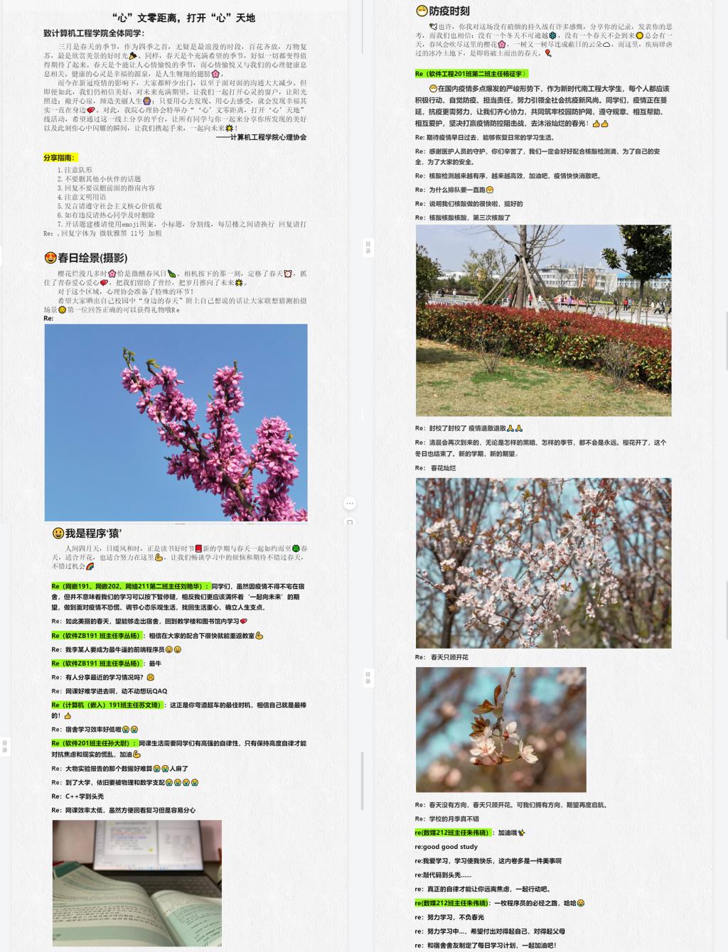 这份共享文档共包含了“春日绘景”“我是程序‘猿’”“干饭之魂燃烧”“防疫时刻”等6个部分,每一个人都能成为记录者和发声者,同学们通过图片共享和文字记录,随时分享当下的所观、所思、所想、所悟。文档中洋溢的满是蓬勃的春天、温暖的情谊、从容的心态和积极的互动。学院第二班主任老师、各班班主任以及辅导员通过“云端”寄语与“云”互动的方式走进学生中间,及时指导帮助学生解决生活、学习中出现的困难,排解心中的困惑,护航学生健康成长。