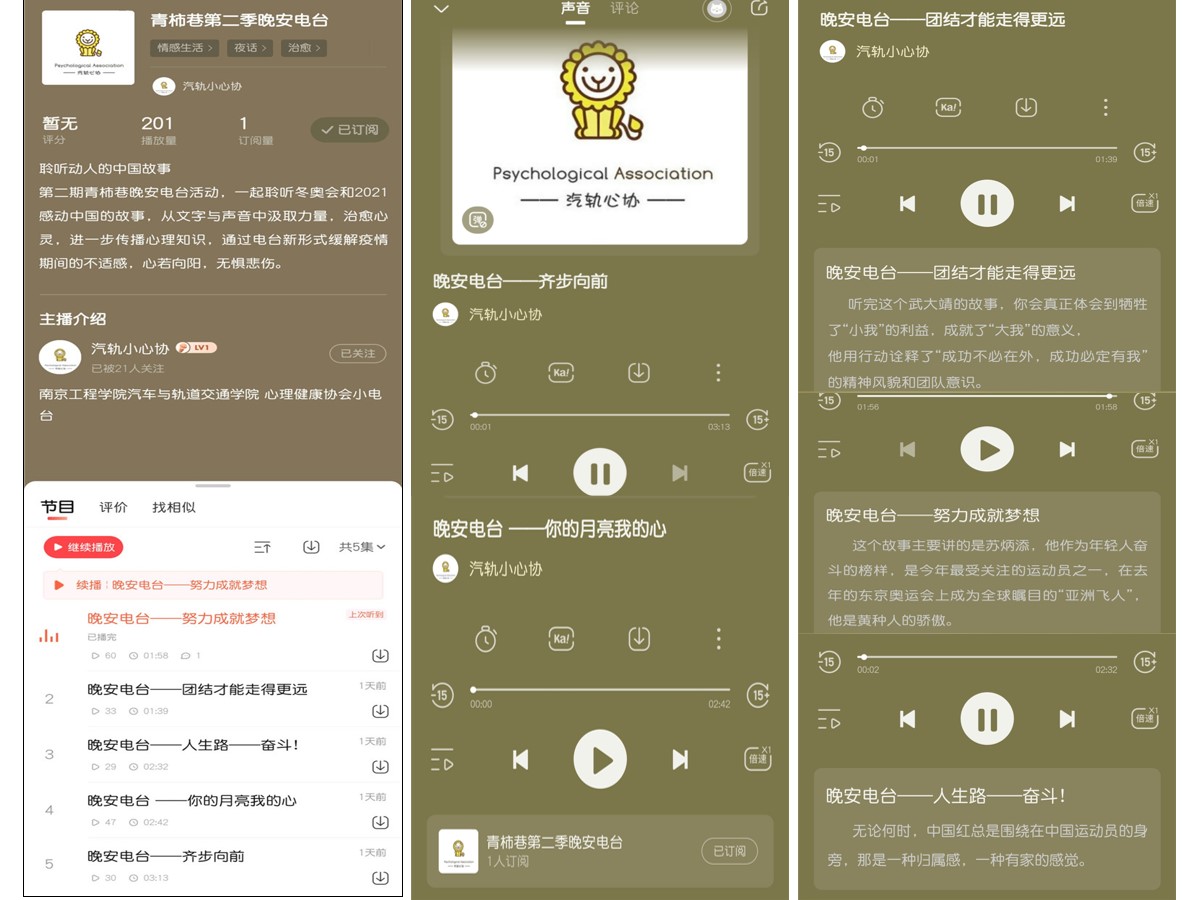 青柿巷“晚安电台”活动是汽轨院常态化心理健康活动之一,学生通过喜马拉雅平台线上朗读、分享心理感受和人生感悟,从文字与声音中获取心理知识、传播温暖力量。本期活动以分享“冬残奥运会励志故事”和“2021感动中国人物”为主题,自4月6日起每晚8点,持续一周向全院学生分享。“晚安电台给了我们展示自我的平台,这些励志故事也缓解了我们封校期间的烦闷情绪,不断给予我们面对疫情的勇气和信心。我们一定会以阳光积极的心态面对生活和学习!”同学们纷纷点赞道。