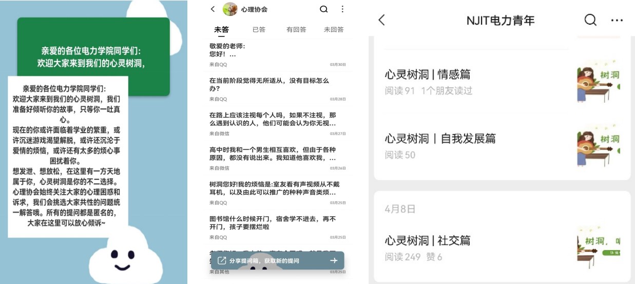 近日,学院为同学们提供了“心灵树洞”,同学们可以在树洞里匿名提出自己的困惑和烦恼。活动过程中,学院师生纷纷化作“知心好友”,提供“解忧”办法。同时学院挑选了大家共性的情绪、心理问题,邀请心理健康教育中心主任李宁老师,与学生“云”谈天。“心灵树洞为不敢于表达,不知道如何发泄情绪的我,打开了一扇门。”一位同学在活动中留言道。