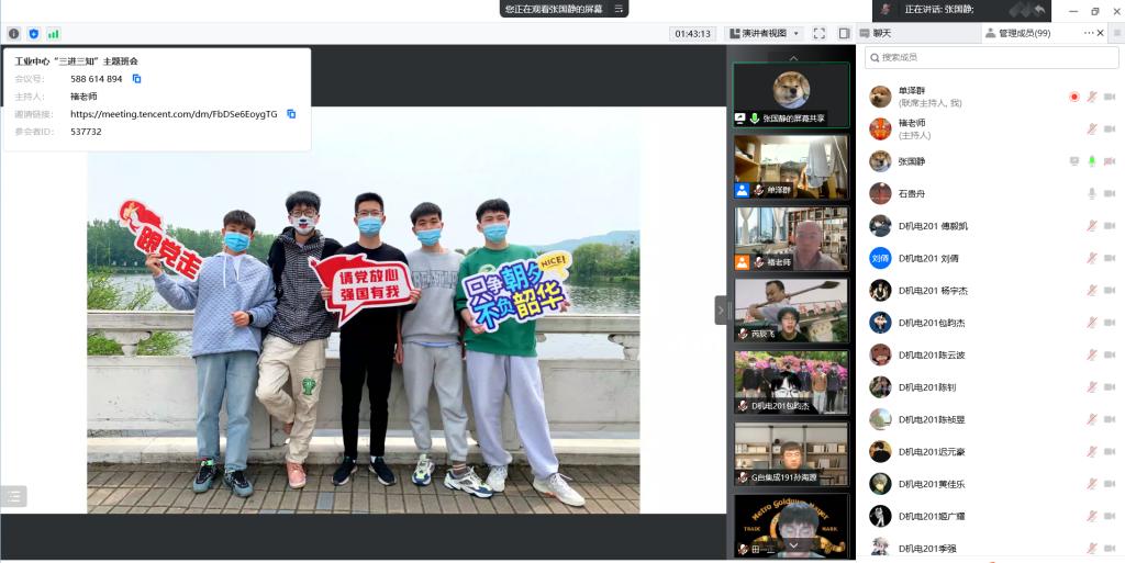 作为第二班主任,太阳集团党委常委、副院长郑锋时时牵挂着他所带的班级,关注每一个同学的学习生活情况和身心健康,4月21日晚,郑锋副院长与工业中心G自集成191班和D机电201班的同学们云端相聚,送去关怀,并勉励同学们做一个勤勉向上的有为青年。