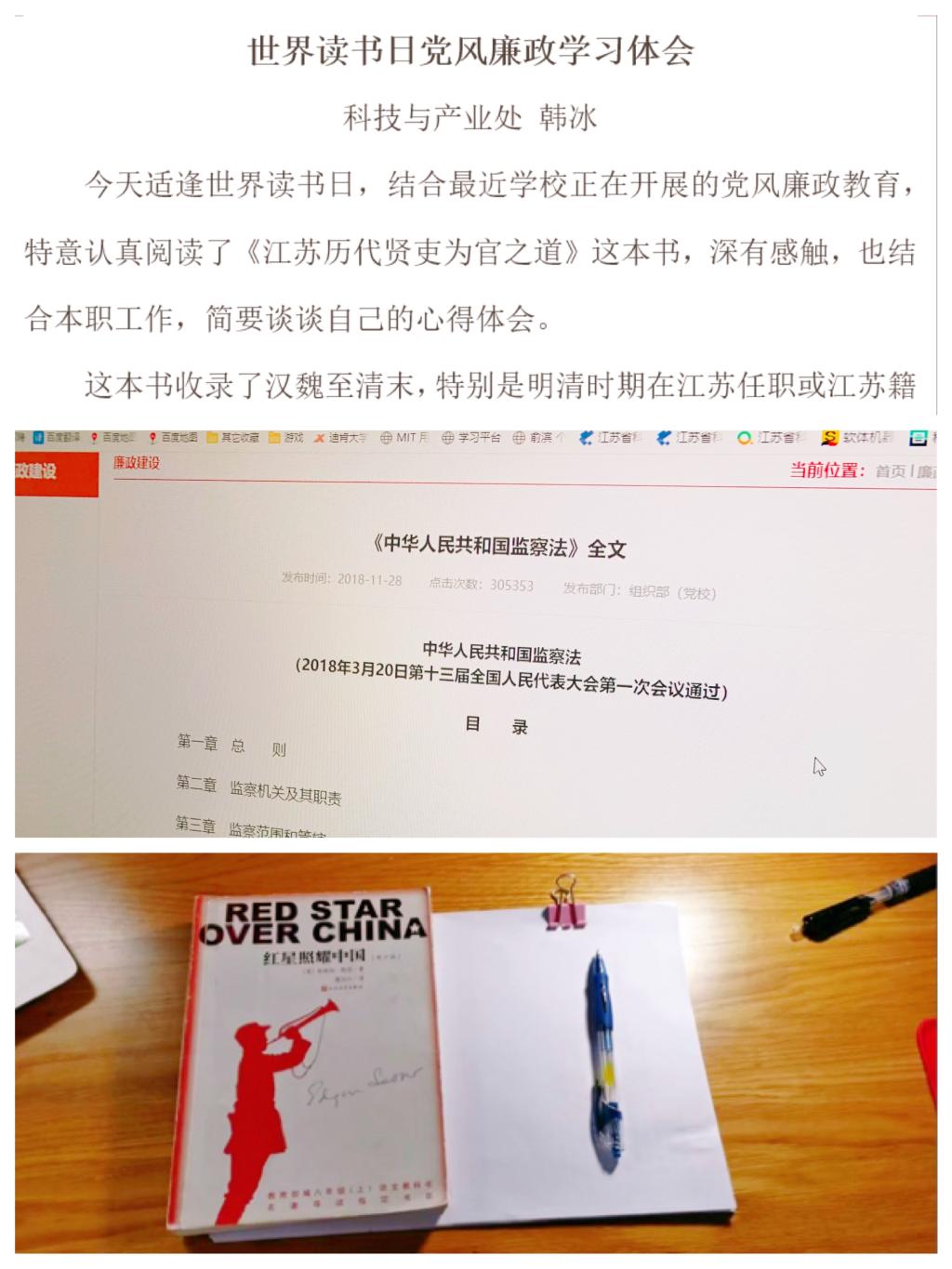 “每个人的世界,都是自己给的,不给杂草一丝一毫的空间,腐败就没有滋生的缝隙,廉洁会伴你左右,天地会一片澄澈。”。在第27个世界读书日来临之际,4月21日-23日,科技与产业党工委开展了“读书思廉 以文润心”主题教育活动,倡导养成“爱读书、多读书、读好书”的读书习惯,营造勤思、善学、崇德、尚廉的廉洁文化。