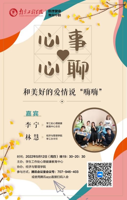“心事心聊”是一档谈话性的心理沙龙活动。活动分别邀请老师与学生嘉宾,共同讨论学生关注的热点话题。近期,心理健康教育中心面向全校开展以“美好爱情”、“压力内卷”、“宿舍关系”、“MBTI人格特质”为主题的“心事心聊”沙龙,与学生共同深入讨论爱情本质、自我意识、人格特质等心理要素,引导学生认识自我、理解他人,建立和谐的人际关系,营造温暖的校园氛围。