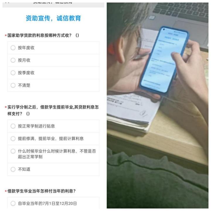 “国家助学贷款的利息按哪种方式收取?答案是……”同学们看着手机上的问卷眉头紧锁。该院举办了诚信资助知识竞答,同学们通过线上问卷进行答题。题目包括国家资助政策、学校资助政策、诚信教育知识和反电诈宣传等内容。此举增强学生的诚信意识和征信意识,让诚信观念在同学们心中更加牢固。能动类2104班潘佳军同学说:“今后我将‘以诚为本,以信为根’,在学习、生活之中以诚相待,做一个诚实守信的人。”