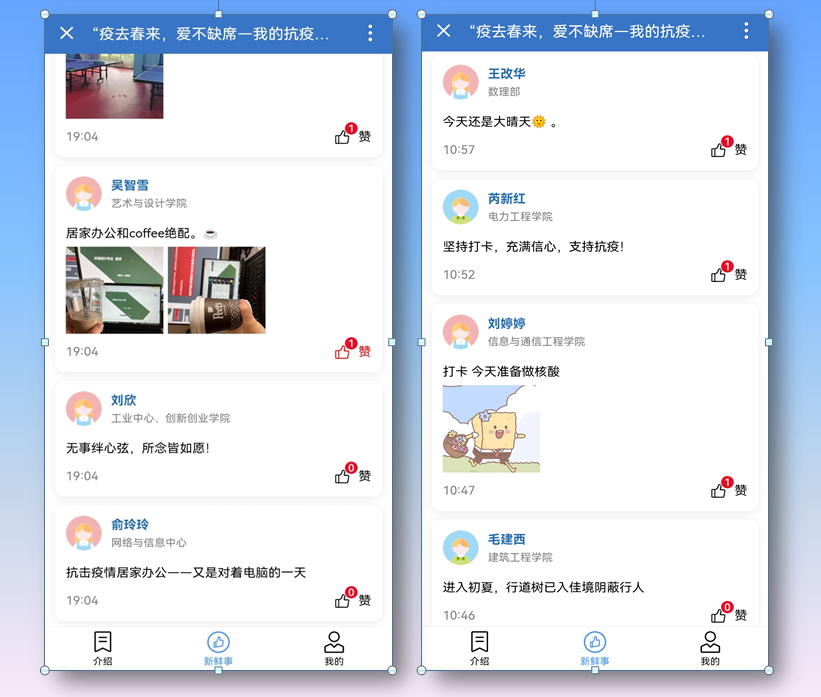 此次打卡活动以“疫去春来 爱不缺席”为主题,倡导教职工在一个月内完成21天打卡。从心理学角度来看,“21天效应”是指从形成一个人新习惯和新理念至少需要的天数。活动期内,教职工每天通过文字或者图片的形式,描述所见所闻、所思所感。或是居家办公间隙发现的美景如画,或是住校轮值体悟到的责任担当,或是线上教学师生互动的平凡快乐,传递着日常学习、生活、工作中的幸福与温暖。经统计,共有近600名教职工通过“智慧工会”平台参加本次活动,累计打卡1.6万余次。