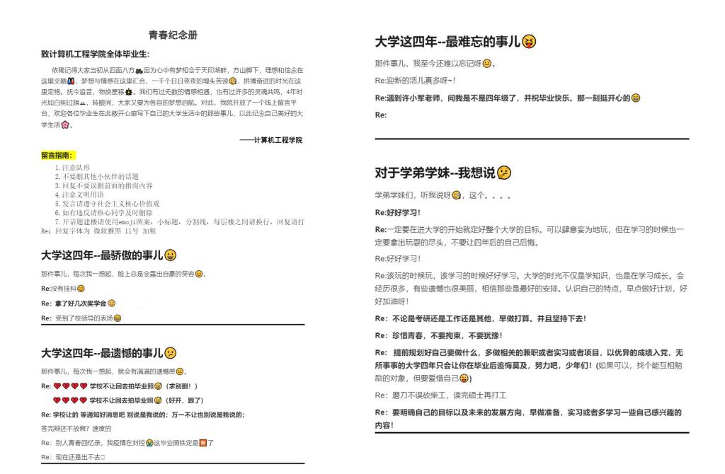 为了让毕业生留下美好的回忆,学院开展了主题为“青春纪念册”的线上共享文档活动。在这份共享文档中,每一个人都能成为记录者和发声者,毕业班的同学们纷纷写下大学四年最难忘和最遗憾的事,通过图片共享和文字记录,随时分享毕业季的所观、所思、所想、所悟,他们在每一次的互动留言中回顾大学四年的经历,感受到了来自学院老师、同学们对他们的关心与鼓励。“就要毕业了,真的是百感交集。感恩母校、恩师的悉心栽培。如果学生是高飞的风筝,母校就是牵挂的线,母校永远在我们心中。”数字媒体(嵌入)181班卫晓妍同学将到东南大学继续深造,“我将带着母校和老师的爱,出去看看世界。”