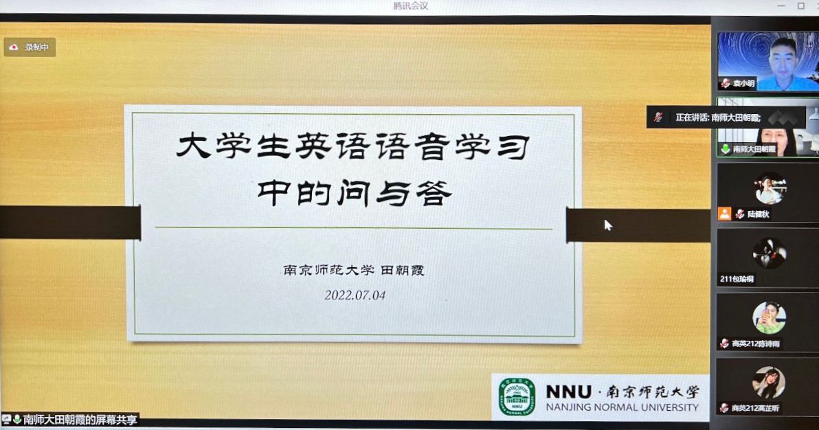 为了进一步提升学校师生英语语音水平,推进复合型英语人才的培养需求,7月4日,外国语学院特邀国内著名语音学专家、南京师范大学外国语学院田朝霞教授,通过腾讯会议线上平台做了题为《大学生英语语音学习的问与答》的学术讲座。讲座由袁小明教授主持,外国语学院及国际教育学院师生共计150余人聆听学习。