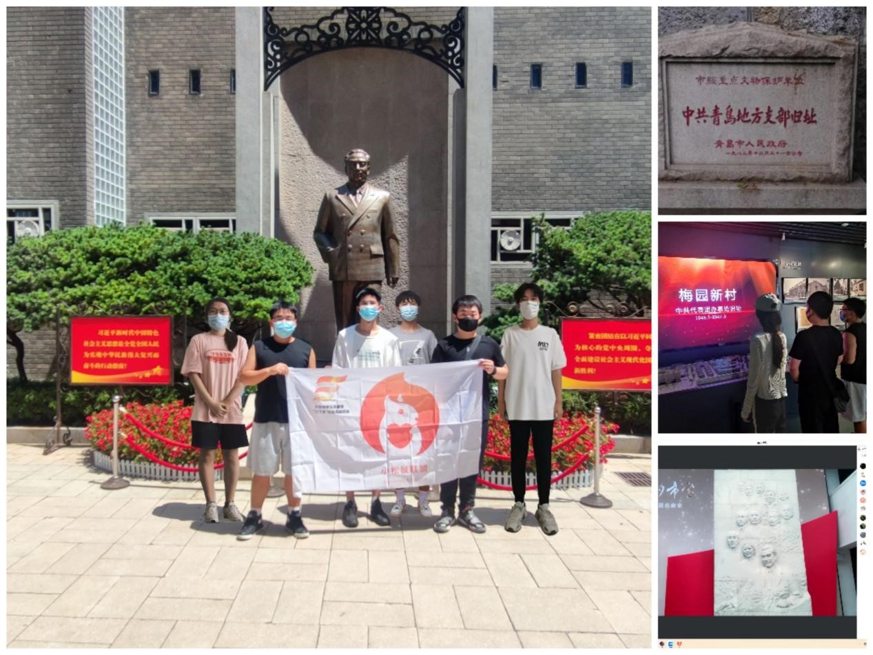 “满天星”团队成员在中共青岛党史纪念馆,认真聆听讲解员的介绍,了解到这里曾经是早期青岛党组织传播马列主义、播撒革命火种、领导工人运动的重要阵地。内厅里大量的文献资料和历史图片仿佛带领同学们回到那个充满风雨的红色时代,外院的党史主题公园矗立着王尽美、邓恩铭、刘少奇、李慰农四位革命先辈的雕塑,供人瞻仰。队员们不禁感慨:“哪有什么岁月静好,只不过有人替你负重前行。现在的美好生活来之不易,我们需懂得感恩珍惜、才能不负时代、不负韶华。”
