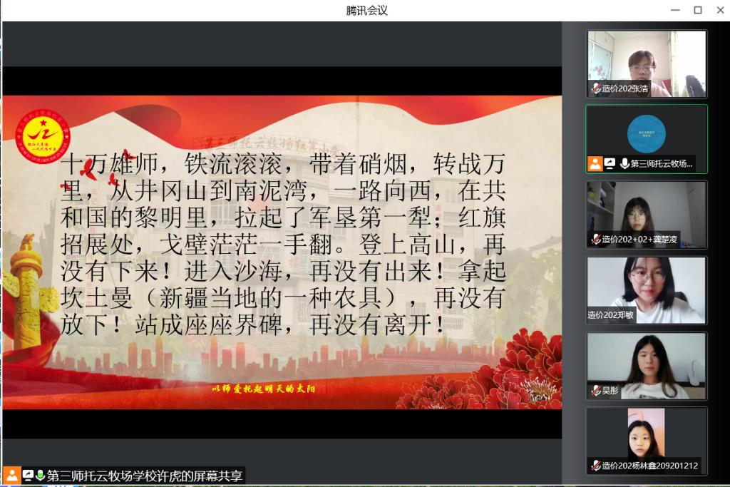 实践团队邀请新疆生产建设兵团第三师托云牧场学校徐虎老师给同学们上了一堂生动的党史课。徐老师以红军革命开篇,介绍了老一代革命者英勇奋斗的无畏精神,并由此展开了对新疆生产兵团的介绍。通过讲座,团队成员了解到新疆生产建设兵团的起源发展、历史贡献和战略作用。“从新中国成立后解放军部队义无反顾迈进茫茫戈壁,坚守祖国边疆;到建设时期兵团战士们克服万难,前仆后继的艰苦创业,开拓进取,把荒芜之地建成如今一座座美丽的宜居之城。如此的成就离不开党和国家对边疆建设的正确领导,离不开各民族之间的相互理解、相互融合和团结互助。”小组成员深受兵团精神的鼓舞,表示将努力学好自身本领,为新时代的祖国建设和民族团结贡献自己的力量。