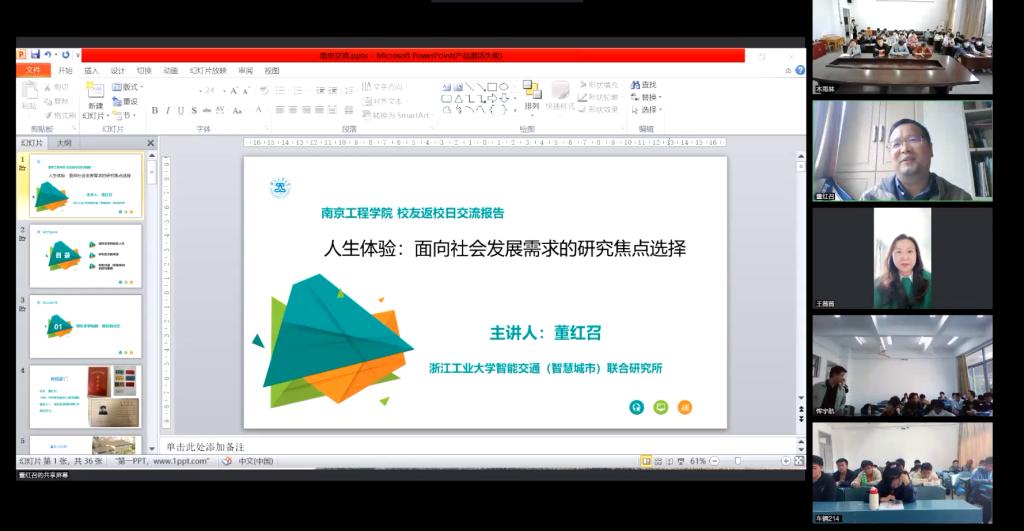 活动中,学院优秀校友、浙江工业大学教授、博导董红召为师生带来主题讲座“人生体验:面向社会发展需求的汽车领域研究焦点选择”,董教授深情回忆了自己的校园学习时光,他感恩母校的栽培,并表示在校学习经历为他后来的学习成长起到了关键性的作用,让他把握到了一个又一个人生发展的重要机遇。董教授介绍了自己的学术研究心得,他认为学术研究应该基于社会发展目标和需要选择方向,在研究过程中认真观察、高度专注、深入思考,方能取得丰硕成果;青年校友2017届高畅、2019届滕飞、2020届王雨薇通过“云”端畅谈自己的成长心得,回溯汽轨岁月,勉励学弟学妹们做好学涯规划和职业规划,珍惜校园时光,奋勇争先。