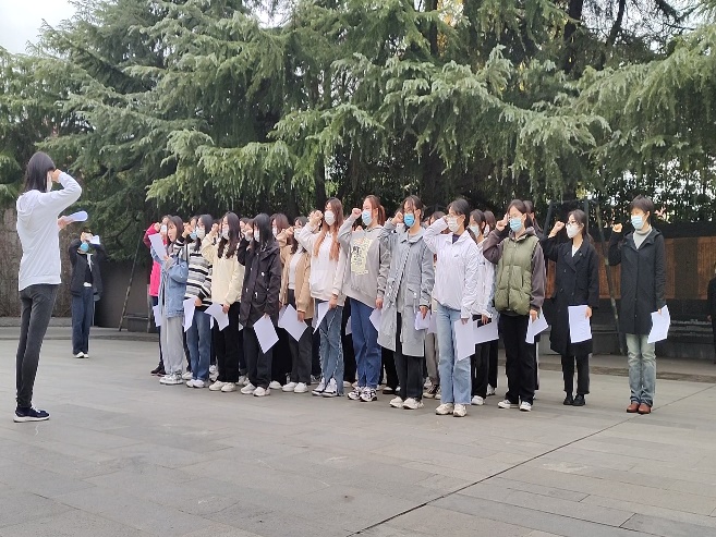 在祭奠广场,同学们庄重地为遇难同胞和革命烈士献上花圈,全体人员肃立默哀。“我们定不会辜负来之不易的和平,定不会忘记这通彻的国殇,更会传承复兴的誓言万众一心,让祖国的花朵生生不息,开创中华民族的辉煌……” 全体同学握拳过肩,立下青春誓言,表明了珍爱和平、铭记历史的坚强信念和永远跟党走、奋进新征程坚定决心。“通过参观学习,我们感受到肩上的责任。”同学们纷纷表示,本次主题团日活动既是一堂生动的信仰公开课,也是一次触动灵魂的实践教育课。作为当代大学生,要铭记历史教训,继承先烈遗志,牢记党的教诲,立志民族复兴,在青春的赛道上奋力奔跑,争取跑出当代青年的最好成绩!