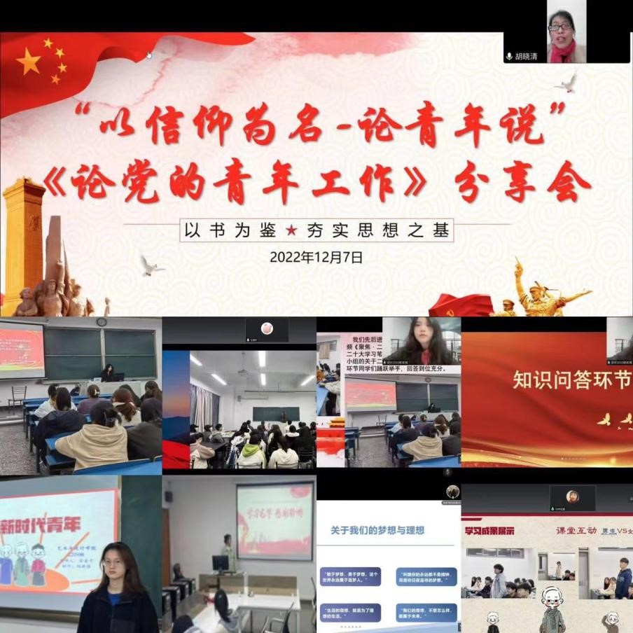 12月7日,学院分团委组织开展“青年说·分享会”,院党委副书记胡晓清、院关工委常务副主任刘极峰以及学工办老师参加分享会。此次分享会为十个优秀团支部进行展示汇报。汇报人以信仰为名,展青年风采,对本支部开展的“青年人的人生价值”线下互动、“书写梦想与理想”、诗歌朗诵、团歌学习等精彩活动进行汇报分享。“青年者,国家之魂”,关工委刘极峰老师在总结点评中鼓励青年人要树立正确的“青年观”。同学们纷纷表示要追求远大理想,深植家国情怀,与国家同呼吸,与人民共命运;传承奋斗担当,做新时代的奋进者、开拓者、奉献者。