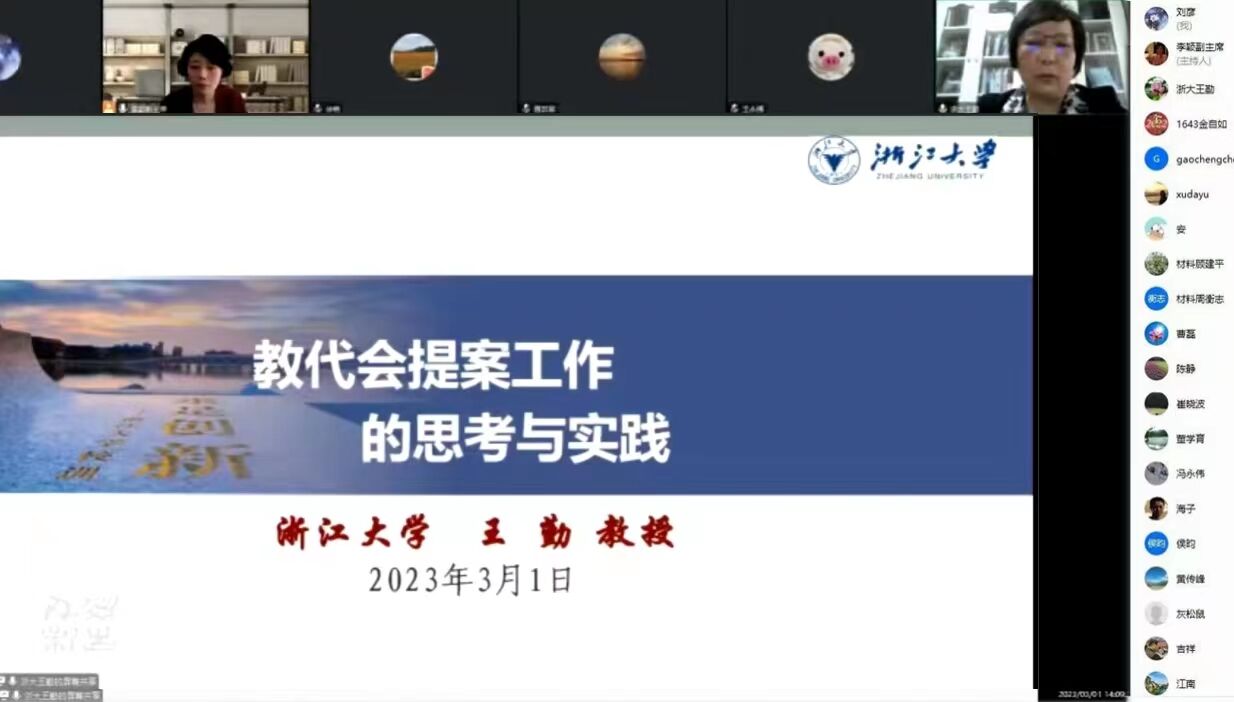 会议邀请浙江大学王勤教授作线上提案工作辅导报告,她从如何认识教代会和教代会提案开始切入,结合浙大教代会提案工作的实践与探索,从高质量提案的要素、提案的常见问题、如何提高提案的质量等方面展开讲解。她说,一个好的提案,方向要明确、问题要清晰、调研要深入、建议要具体、参办要积极、监督要主动。她鼓励参会代表站位全局、着眼长远、立足实际,以更大的担当作为,汇聚各方智慧,确保提案工作在解决教职工实际问题、推动学校教学科研工作、影响学校政策制定等方面发挥有效作用。王教授长期从事政治文化、德育理论、妇女发展等方面的研究,在浙江大学分管教代会提案工作多年,她的讲座既有翔实的理论基础,又有丰富的案例支撑,深受大家的好评。
